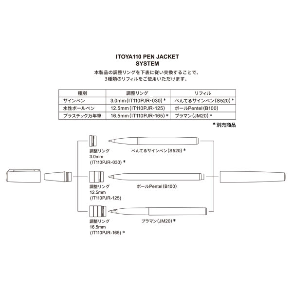 ※リフィルをサインペンに変更する際は、別売の「調整リング 3.0mm (IT110PJR-030)」と「ぺんてるサインペン (S520)」をご使用ください。