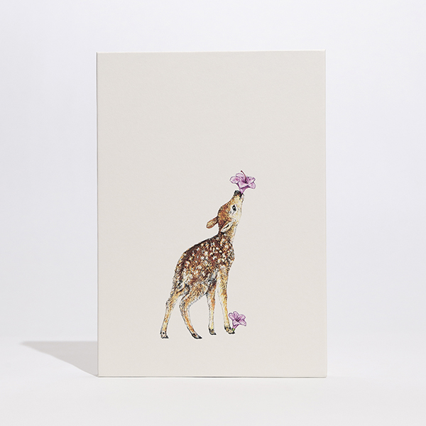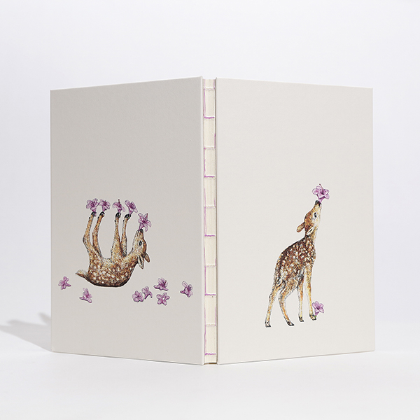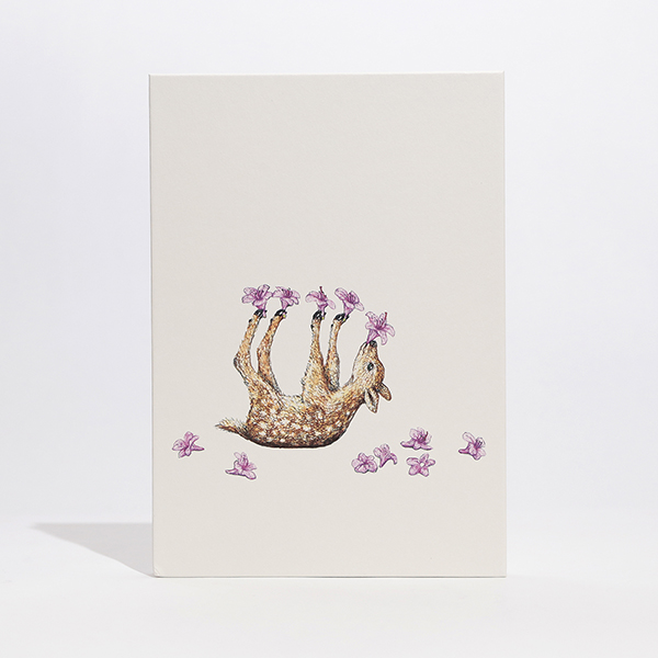 裏面には両手両足、全身を使い夢中になって蜜を吸う姿も。無邪気な小鹿の姿にクスッとなる、表と裏でストーリーを感じられる一冊となっています。