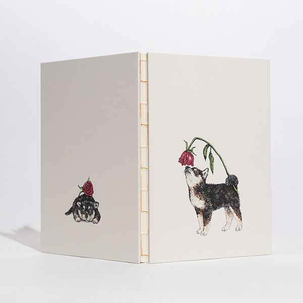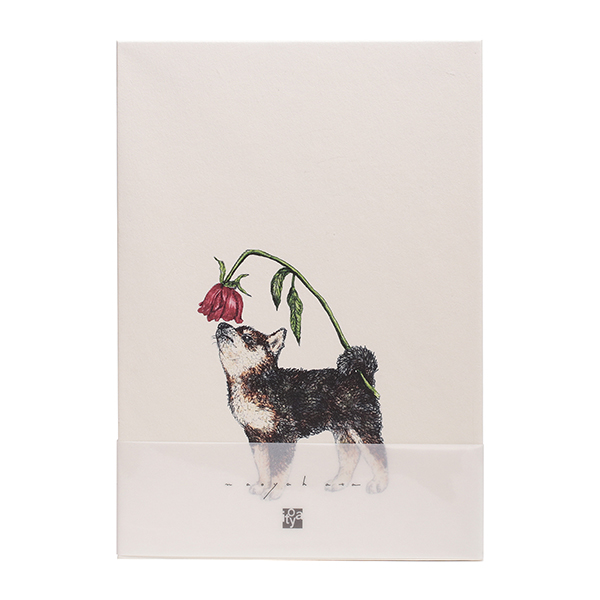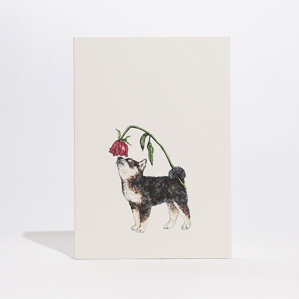 尻尾を器用に使ってバラの香りを楽しむ柴犬を描いた、若手クリエイターの秦直也とコラボレーションした伊東屋オリジナルノートです。
