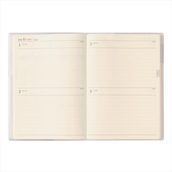 【日記欄】見開きで4日分の記録ができる1ページ2日タイプ。日記や業務日誌など、1日の記録をたっぷり記入したい人におすすめのレイアウトです。