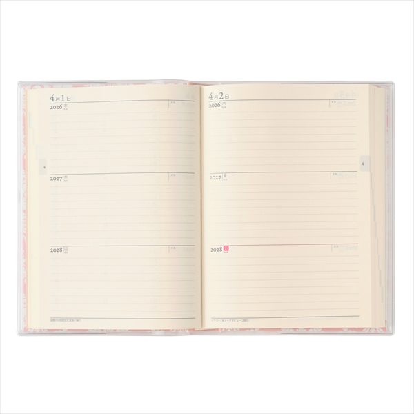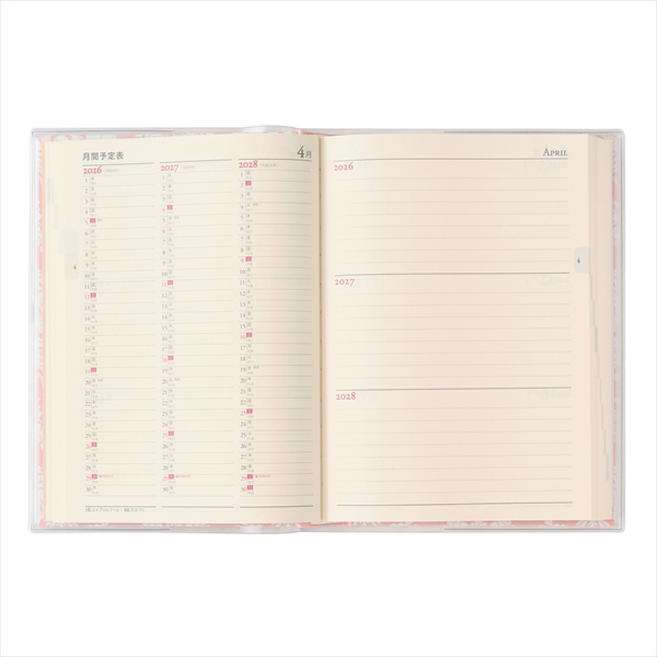 【月間ページ】見開き1ヵ月で日付が縦に並ぶ罫ページタイプ。長期の予定を書くのに便利です。