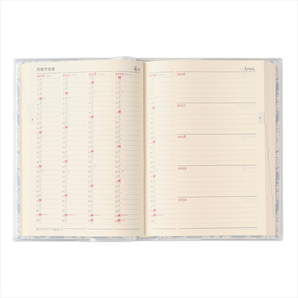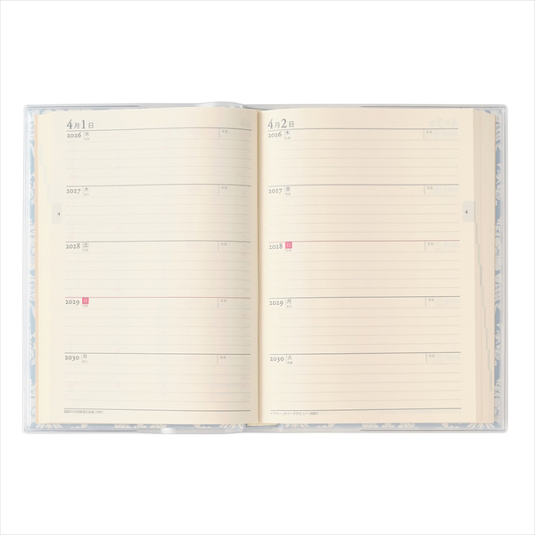 【月間ページ】見開き1ヵ月で日付が縦に並ぶ罫ページタイプ。長期の予定を書くのに便利です。