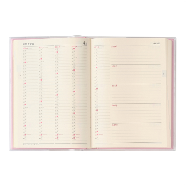 【月間ページ】見開き1ヵ月で日付が縦に並ぶ罫ページタイプ。長期の予定やプロジェクト管理に便利です。