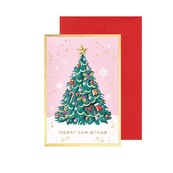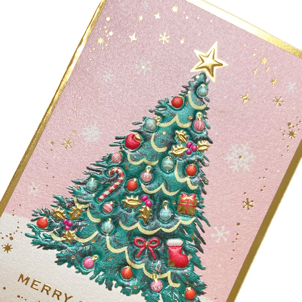 ピンクの背景とクリスマスツリーの洋風クリスマスミニカードです。