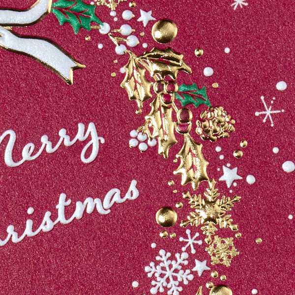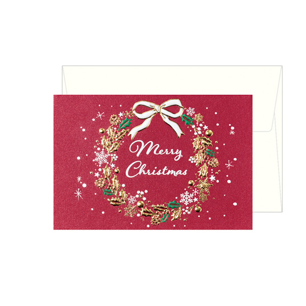 箔加工が美しいシンプルなリースが描かれた洋風クリスマスミニカードです。箔、浮き出し加工。「Merry Christmas」の文字入り。