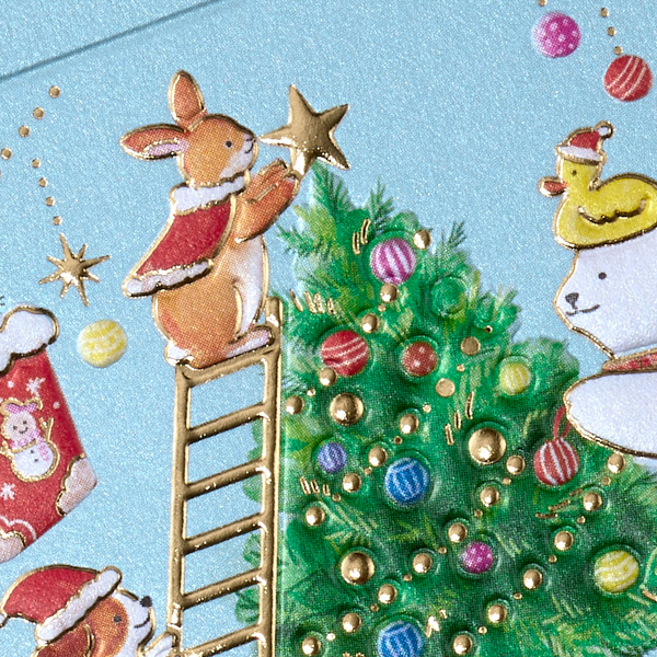 動物たちがツリーの飾り付けをしている様子を描いた洋風クリスマスミニカードです。箔、浮き出し加工。「Merry Christmas」の文字入り。