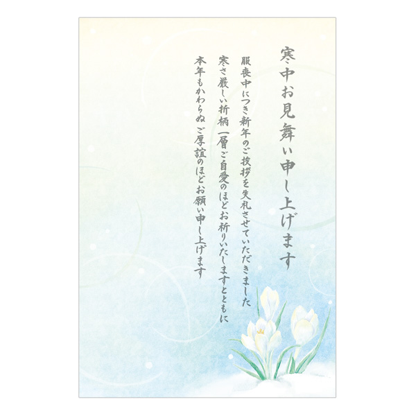 クロッカスが描かれた、服喪中の際にご使用いただける寒中はがきです。文章「寒中お見舞い申し上げます 服喪中につき新年のご挨拶を失礼させて頂きました 寒さ厳しい折柄一層ご自愛のほどお祈りいたしますとともに 本年もかわらぬご厚誼のほどお願い申し上げます」