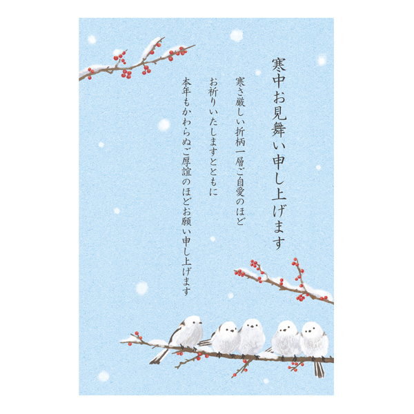 ウメモドキにシマエナガがとまっている風景が描かれた、寒中はがきです。文章「寒中お見舞い申し上げます 寒さ厳しい折柄一層ご自愛のほどお祈りいたしますとともに 本年もかわらぬご厚誼のほどお願い申し上げます」