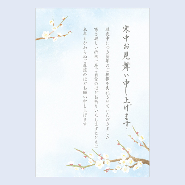 白梅が描かれた、服喪中の際にご使用いただける寒中はがきです。