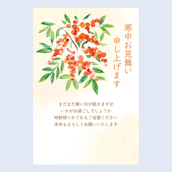 春の訪れを感じる温かみのある色彩と赤い南天が描かれた寒中はがきです。