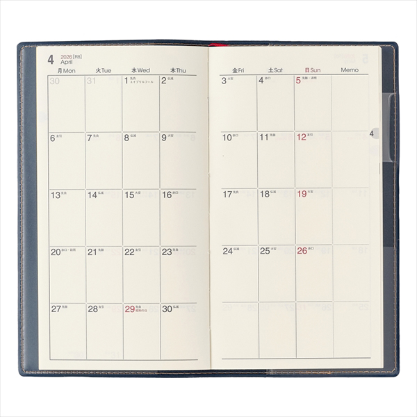 【月間ページ】見開き1ヶ月のベーシックなブロックタイプ(月曜始まり)。