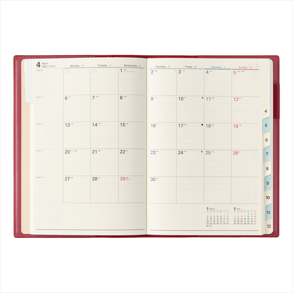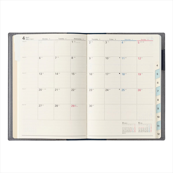 【月間ページ】見開き1ヶ月のベーシックなブロックタイプ(月曜始まり)。カレンダーと同じような感覚で見ることができ、週ごとの予定が把握しやすいのが特徴です。