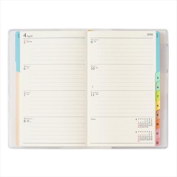 【月間ページ】見たいページがパッと開けるインデックス付き(日曜始まり)。