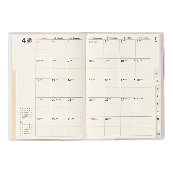 【月間ページ】持ち運びにも便利なA6サイズ(日曜始まり)。すっきりとしたデザインのレイアウトで、ストレスなく書き込めます。1日のマスを上下に二分割しているので「午前/午後」「自分/家族」など予定を整理して記入できます。