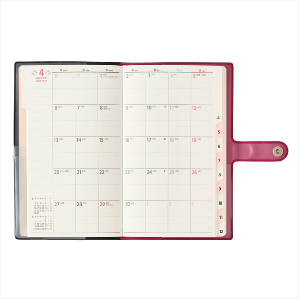 【月間ページ】見開き1ヵ月のブロックタイプ(月曜始まり)。カレンダー感覚で週ごとの予定が把握しやすく、見たいページをパッと開けるインデックス付きです。