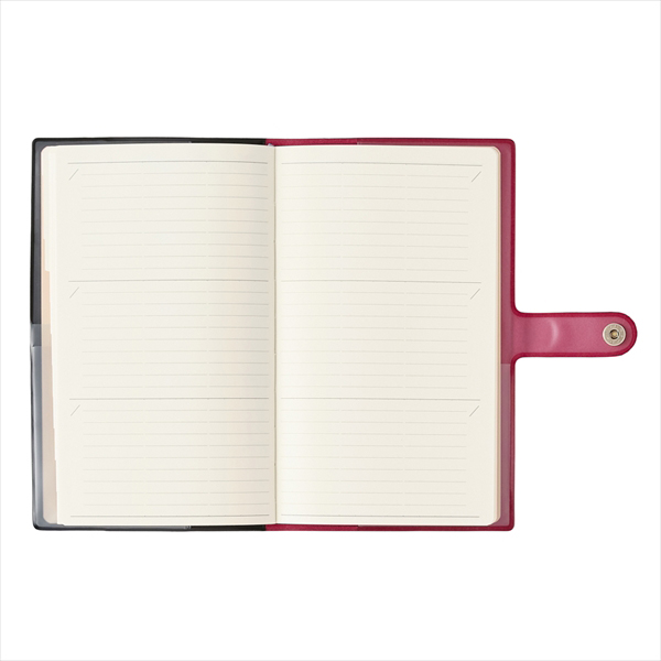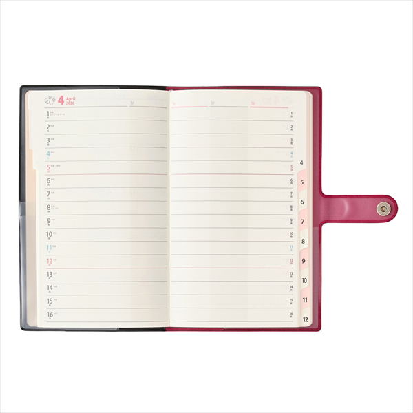 【週間ページ】見開き2週間で日付が縦に並ぶ罫ページタイプのレイアウト。記入スペースが5分割されているので、家族の予定など項目ごとに見やすく整理して記入できるのが特長です。