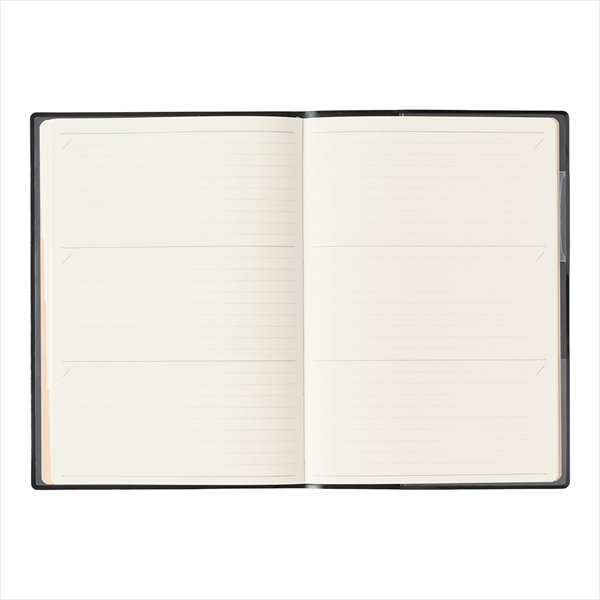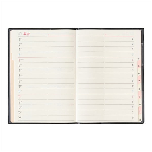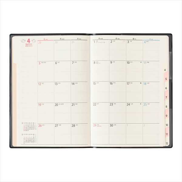 【月間ページ】見開き1ヵ月のブロックタイプ(日曜始まり)。カレンダー感覚で月ごとの予定が把握しやすく、見たいページをパッと開けるインデックス付き。