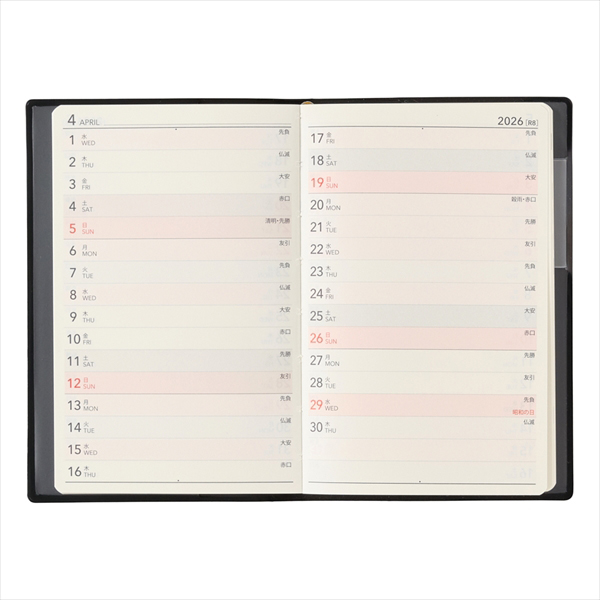 【月間ページ】日付が縦に並ぶ罫ページタイプのレイアウト。長期の予定やプロジェクト管理に便利です。