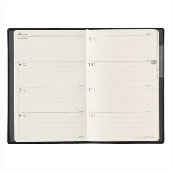 【週間ページ】見開き1週間のメモタイプのレイアウト(月曜始まり)。1日分のスペースが広いので、日記などの記録に便利です。