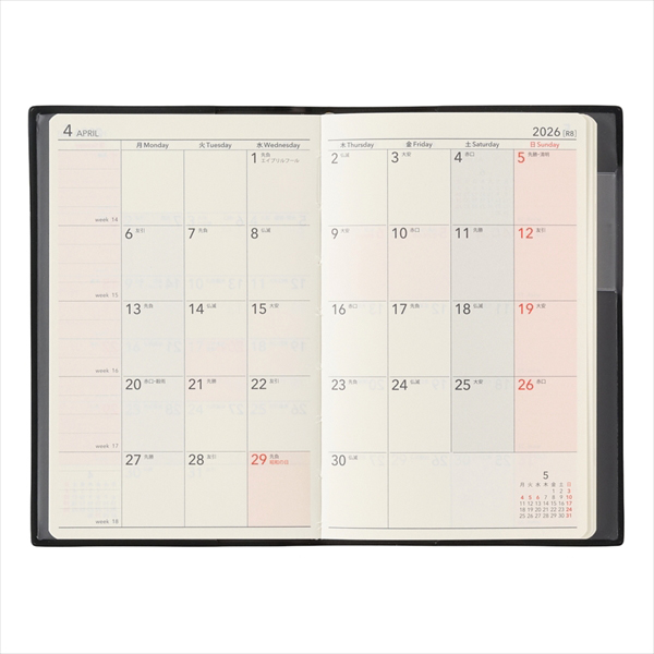【月間ページ】見開き1ヶ月のベーシックなブロックタイプ(月曜始まり)。カレンダーと同じような感覚で見ることができ、週ごとの予定が把握しやすいのが特徴です。