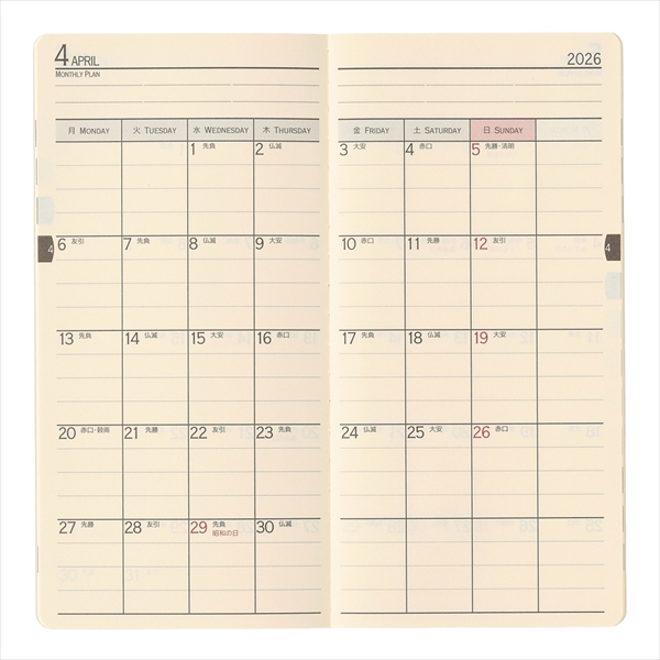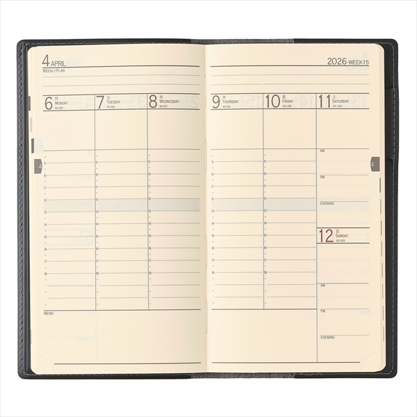 週間ページ下部の両角に切り取りミシンがあり、しおり代わりに使えて検索性も抜群。