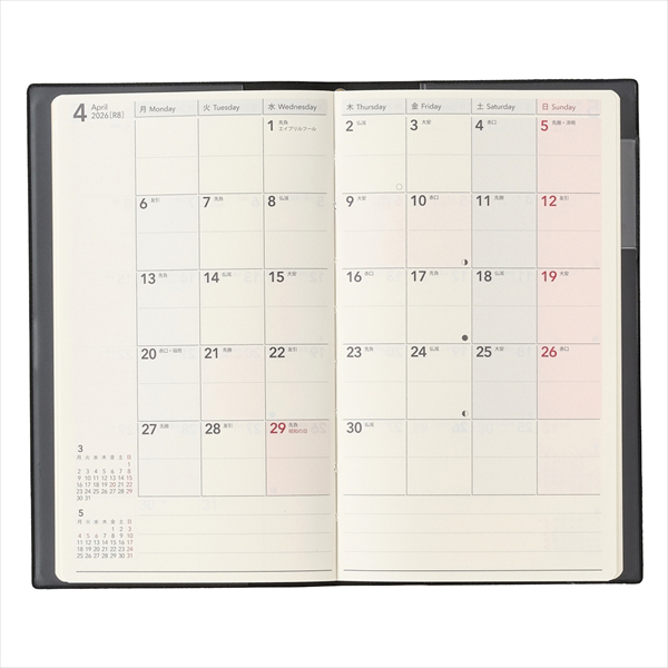 【月間ページ】見開き1ヶ月のベーシックなブロックタイプ(月曜始まり)。