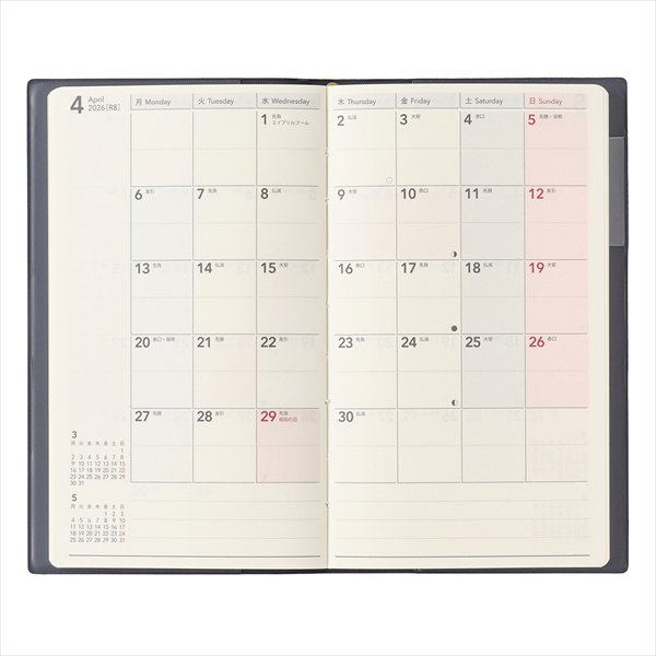 【月間ページ】見開き1ヶ月のベーシックなブロックタイプ(月曜始まり)。