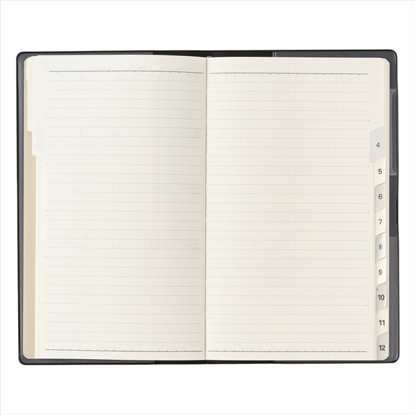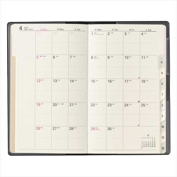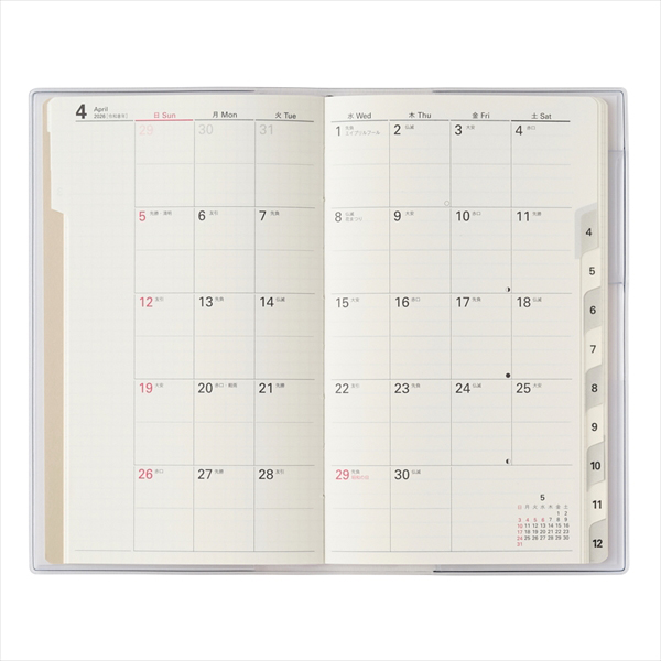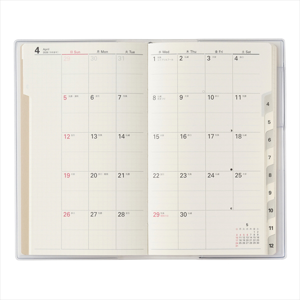 【月間ページ】見開き1ヵ月のベーシックなブロックタイプ(日曜始まり)。各月ごとに罫ページと方眼ページが付いているので、その月のできごとをメモするのに便利。