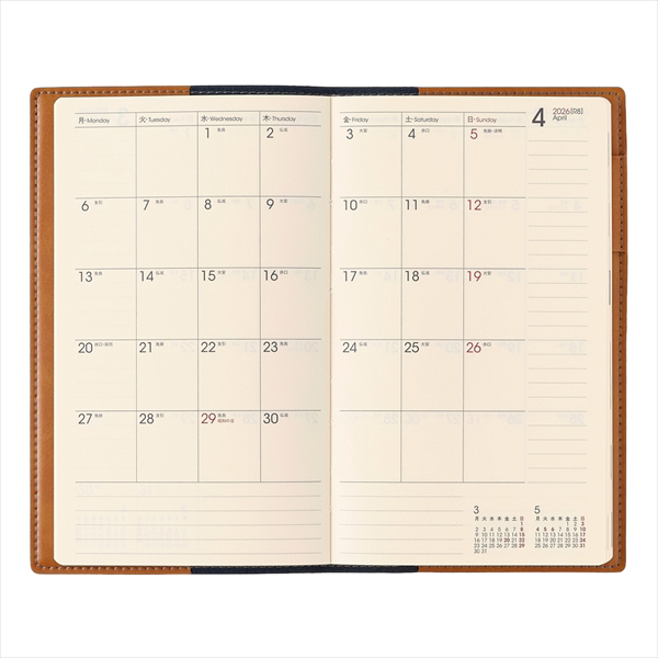 【月間ページ】見開き1ヶ月のベーシックなブロックタイプ(月曜始まり)。