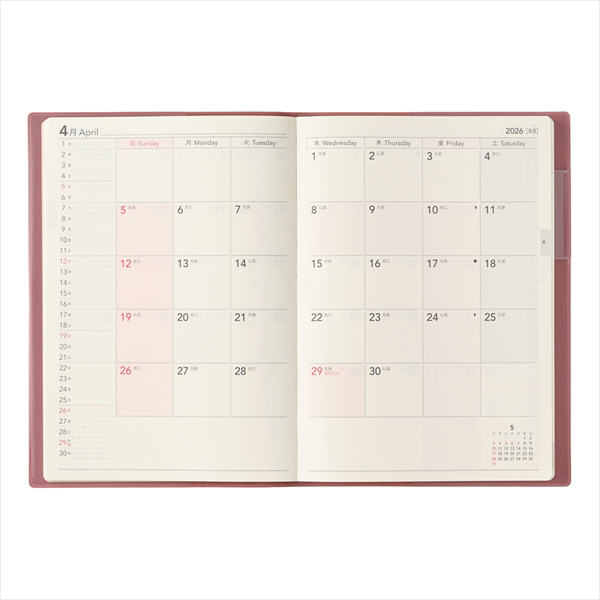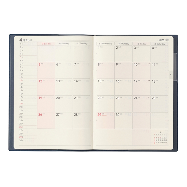 【月間ページ】見開き1ヶ月のベーシックなブロックタイプ(日曜始まり)。カレンダーと同じような感覚で見ることができ、週ごとの予定が把握しやすいのが特徴です。