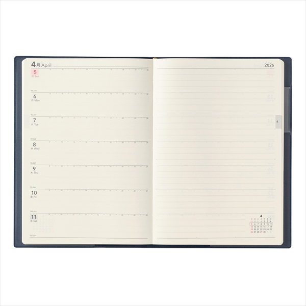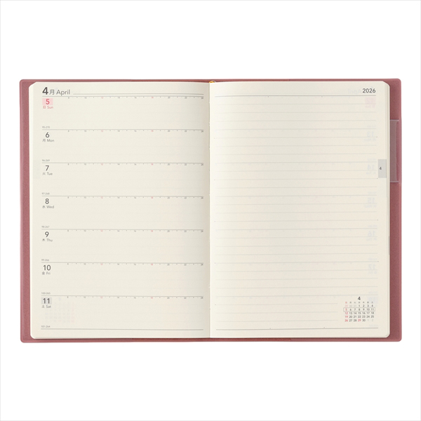 【週間ページ】見開き1週間で左ページに予定、右ページはメモスペースとして使えるレフトタイプ(日曜始まり)。予定とメモにバランスの良い手帳です。