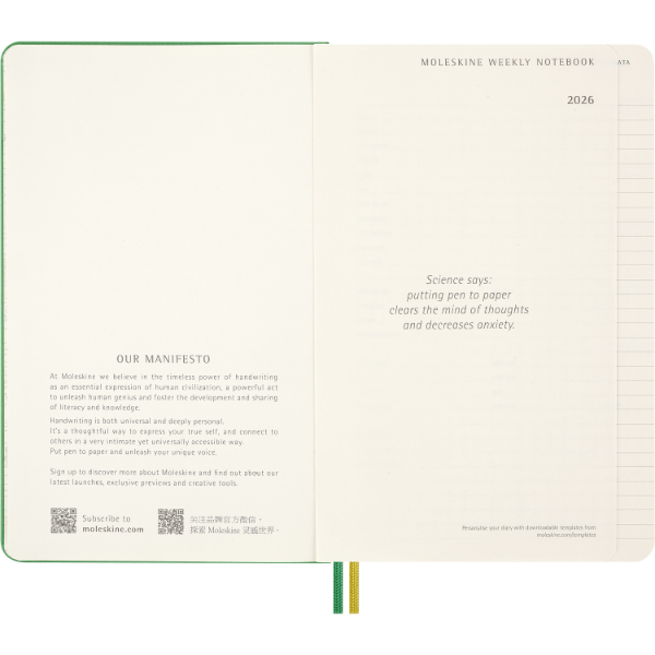 日々のプランや成果を記録できる Peanuts x モレスキン 12ヵ月ダイアリー。時代が変わっても、手で書き記すという作業の魅力が薄れることはありません。Peanuts の人気キャラクターのイラストと名言をフィーチャーした2026年1月~12月のウィークリーダイアリー。きっと、手書き文化の価値を再発見できることでしょう。