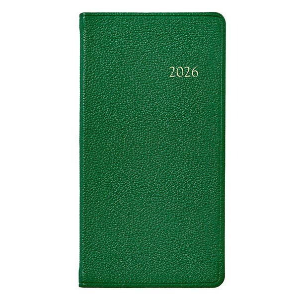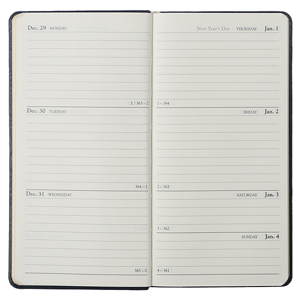 シボ感のあるゴートスキン(山羊革)カバーに表紙への年号のゴールドスタンプ、というシンプルなデザインが素材の良さと機能美を際立たせています。