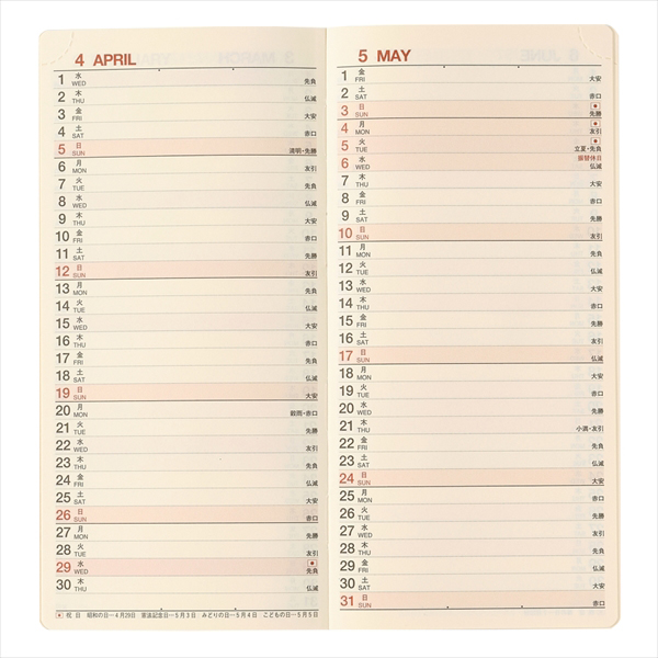 【月間ページ】見開き2ヶ月で日付が縦に並ぶ罫ページタイプのレイアウト。長期の予定やプロジェクト管理に便利です。