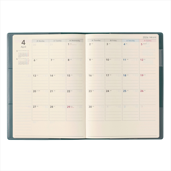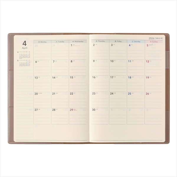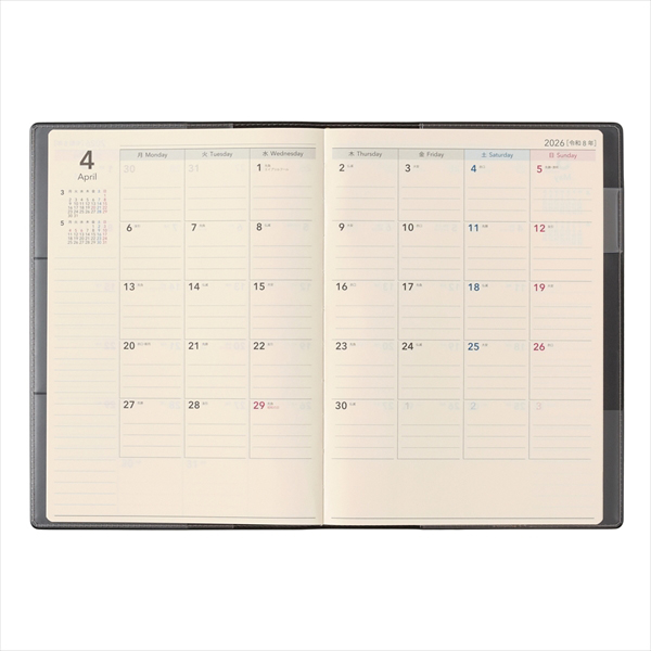 【月間ページ】見開き1ヶ月のベーシックなブロックタイプ(月曜始まり)。カレンダーと同じような感覚で見ることができ、週ごとの予定が把握しやすいのが特徴です。