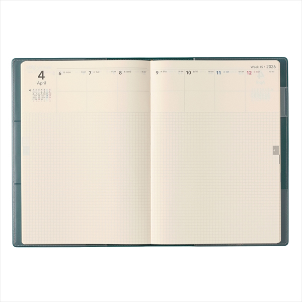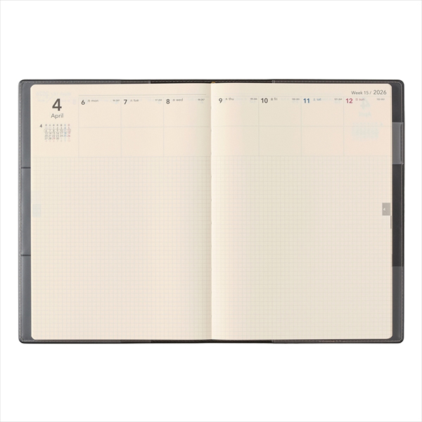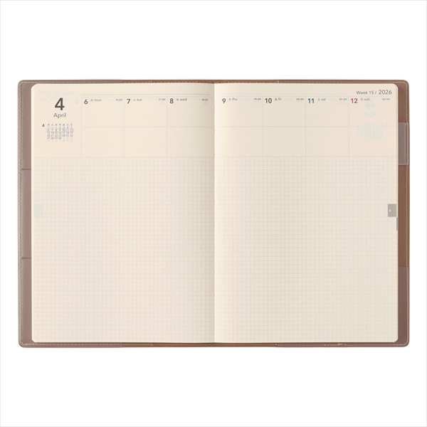【週間ページ】上部のスケジュール欄(月曜始まり)で予定を把握しながら、たっぷりの方眼メモスペースはノートのように使えます。手帳とノートを一元管理したい方や自由にカスタマイズしたい方におすすめです。