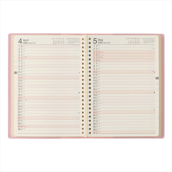 【月間ページ】見開き2ヶ月で日付が縦に並ぶ罫ページタイプのレイアウト。長期の予定やプロジェクト管理に便利です。
