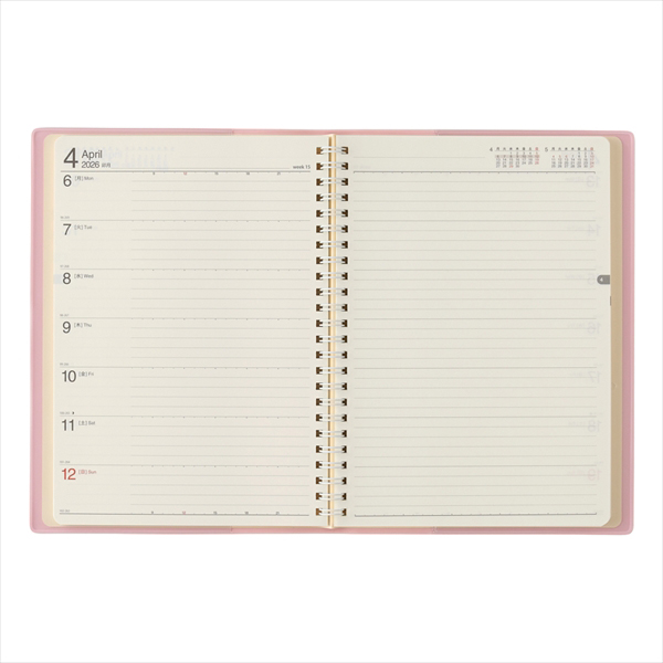 【週間ページ】見開き1週間のレフトタイプ(月曜始まり)。予定とメモにバランスの良い手帳です。