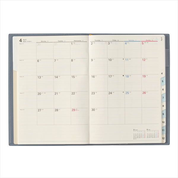 【月間ページ】見開き1ヶ月のベーシックなブロックタイプ(月曜始まり)。カレンダーと同じような感覚で見ることができ、週ごとの予定が把握しやすいのが特徴です。