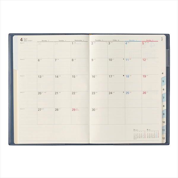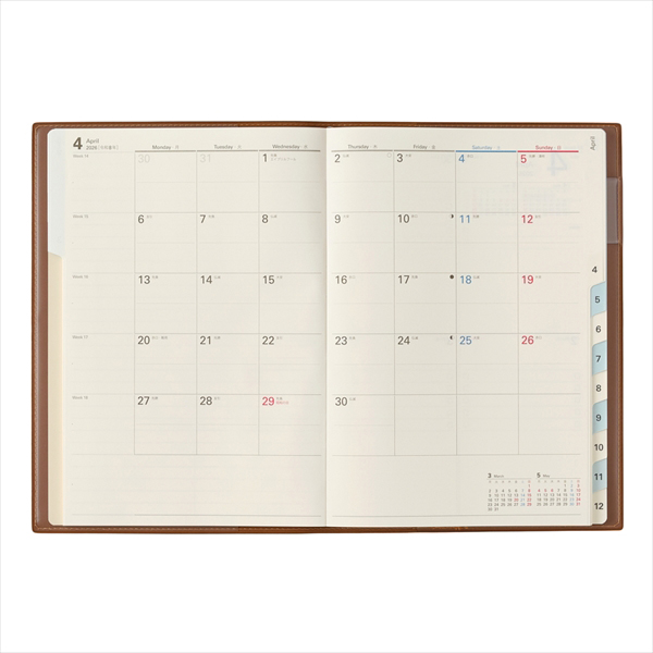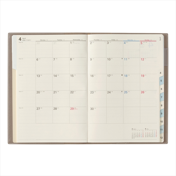 【月間ページ】見開き1ヶ月のベーシックなブロックタイプ(月曜始まり)。カレンダーと同じような感覚で見ることができ、週ごとの予定が把握しやすいのが特徴です。