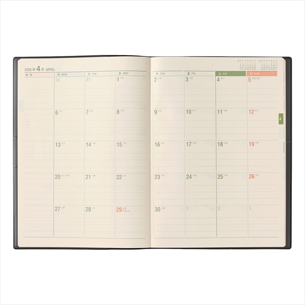 【月間ページ】見開き1ヶ月のベーシックなブロックタイプ(月曜始まり)。カレンダーと同じような感覚で見ることができ、週ごとの予定が把握しやすいのが特徴です。