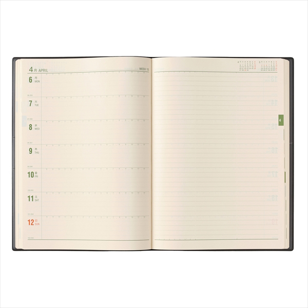 【週間ページ】見開き1週間で左ページに予定、右ページはメモスペースとして使えるレフトタイプ(月曜始まり)。予定とメモにバランスの良い手帳です。