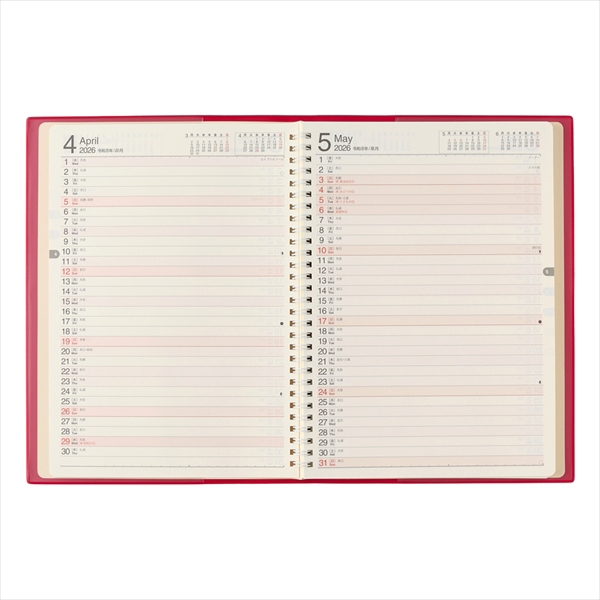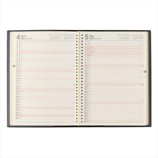【月間ページ】見開き2ヶ月で日付が縦に並ぶ罫ページタイプのレイアウト。長期の予定やプロジェクト管理に便利です。