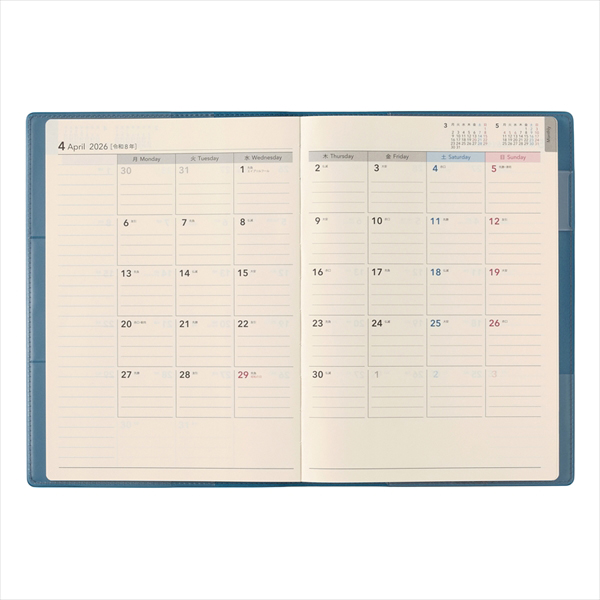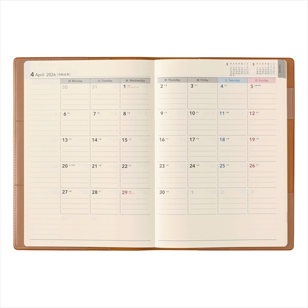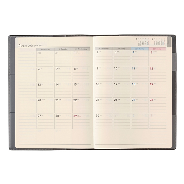 【月間ページ】見開き1ヶ月のベーシックなブロックタイプ(月曜始まり)。カレンダーと同じような感覚で見ることができ、週ごとの予定が把握しやすいのが特徴です。