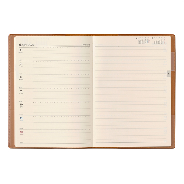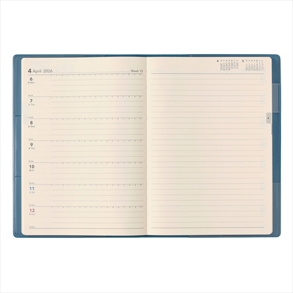 【週間ページ】見開き1週間で左ページに予定、右ページはメモスペースとして使えるレフトタイプ(月曜始まり)。予定とメモにバランスの良い手帳です。