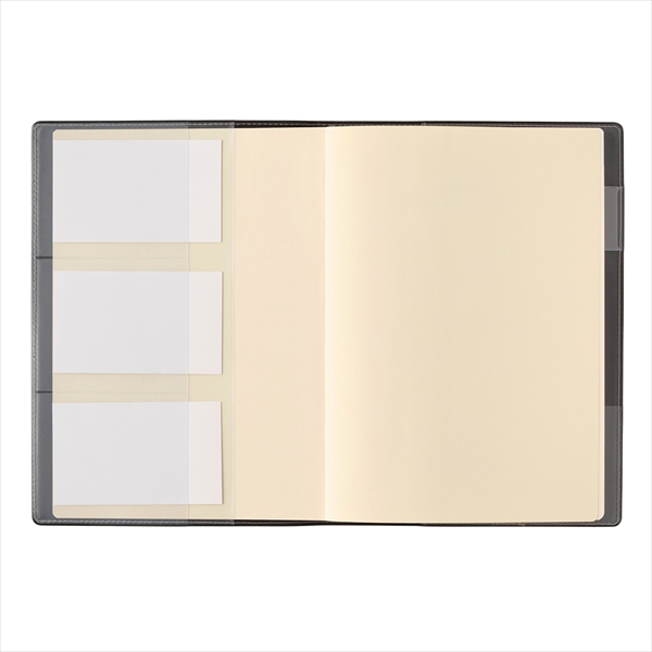 カバー前側には3段名刺ポケット、カバー後ろ側には名刺ポケット・ペンホルダーが付いています。
