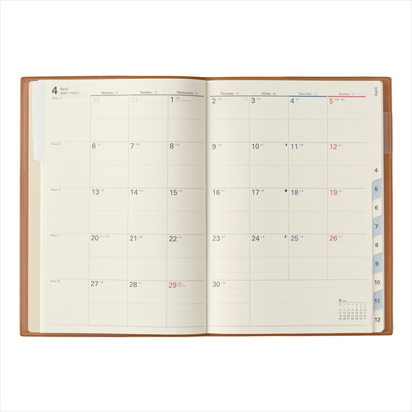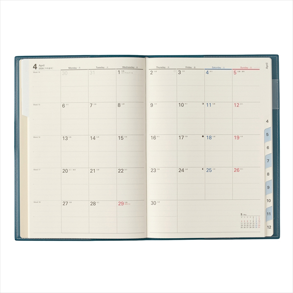 【月間ページ】見開き1ヶ月のベーシックなブロックタイプ(月曜始まり)。カレンダーと同じような感覚で見ることができ、週ごとの予定が把握しやすいのが特徴です。