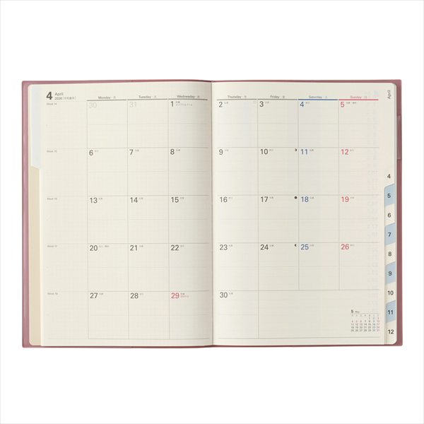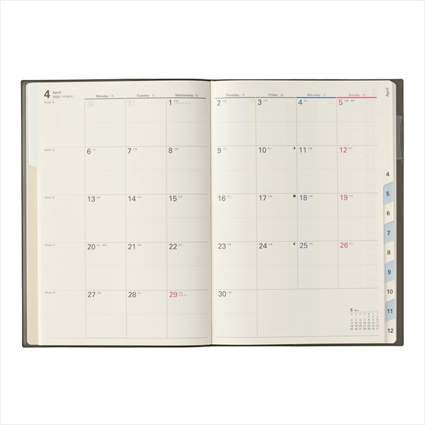 【月間カレンダー】見開き1ヶ月のベーシックなブロックタイプ(月曜始まり)。カレンダーと同じような感覚で見ることができ、週ごとの予定が把握しやすいのが特徴です。