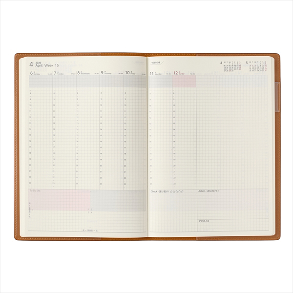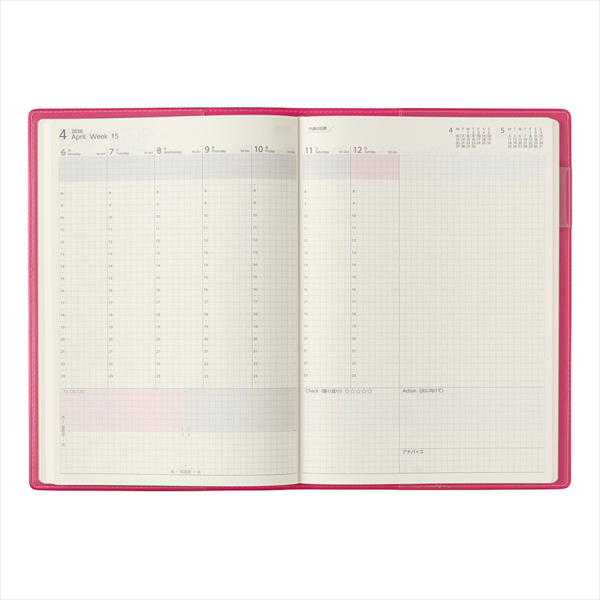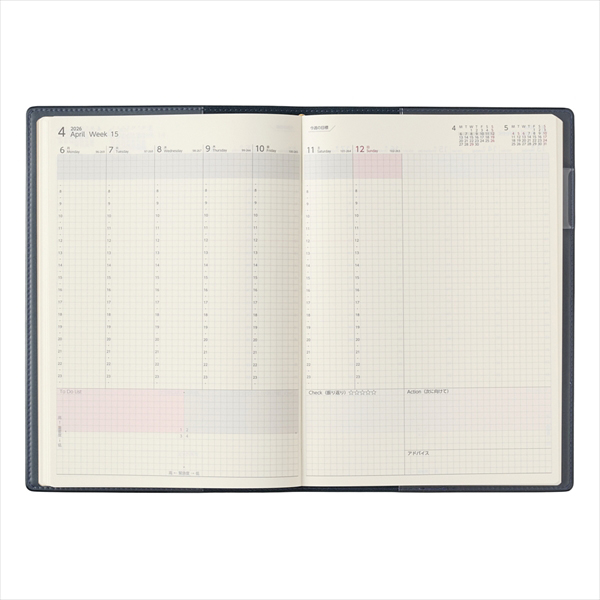 見開き1週間で空き時間がわかりやすい方眼バーチカルタイプです。余白もたっぷりあり、打ち合わせの内容やアイデアを書き込めます。