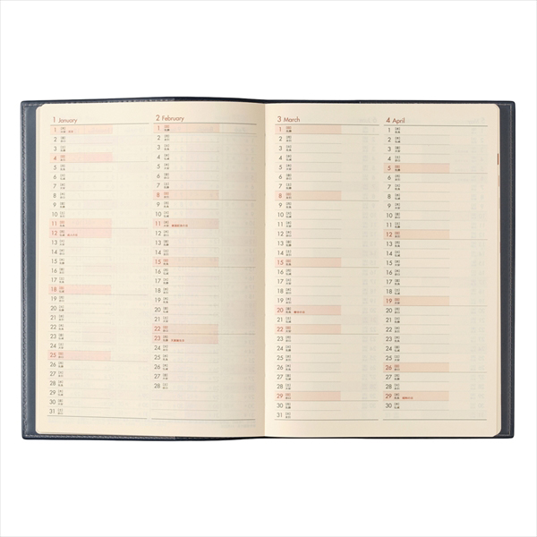 【月間ページ】見開き4ヶ月で日付が縦に並ぶ罫ページタイプのレイアウト。長期の予定やプロジェクト管理に便利です。